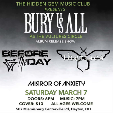 Come out and listen to live music from Bury Us All, Before the Day, Theriaca, and Mirror of Anxiety! Doors at 6PM, Show starts at 7PM! All ages are welcome and only $10 at the door! Amazing drinks and food from the Hidden Gem bar and kitchen! We hope to see you there!
